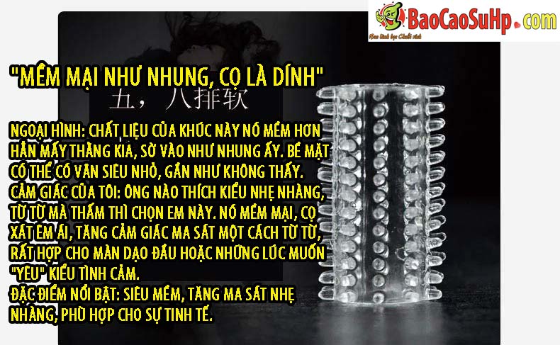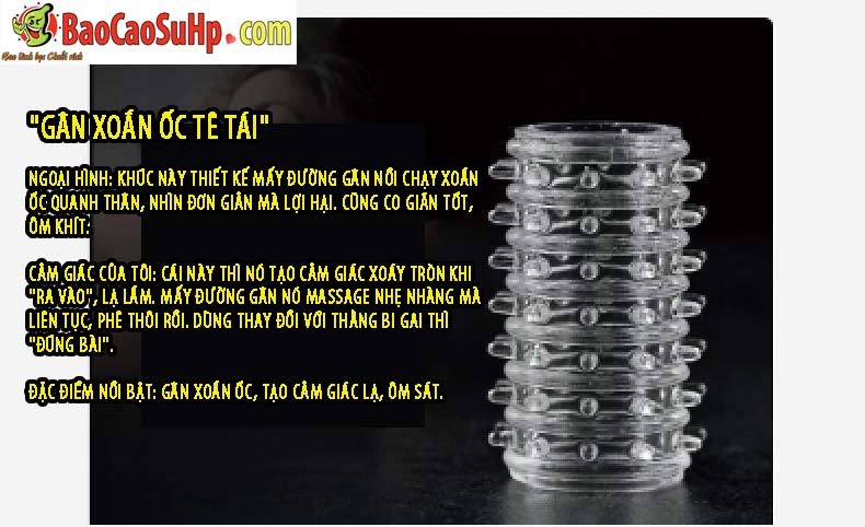Đặc trưng bởi các đường gân xoắn ốc nổi dọc thân, ôm sát và co giãn tốt. Khúc này mang lại cảm giác xoáy tròn độc đáo, vừa mát-xa nhẹ nhàng nhưng liên tục tạo sự sảng khoái khó quên. Sự kết hợp tuyệt vời cùng “Chiến Binh Bi Gai” sẽ đem đến trải nghiệm đa chiều và đầy thú vị.