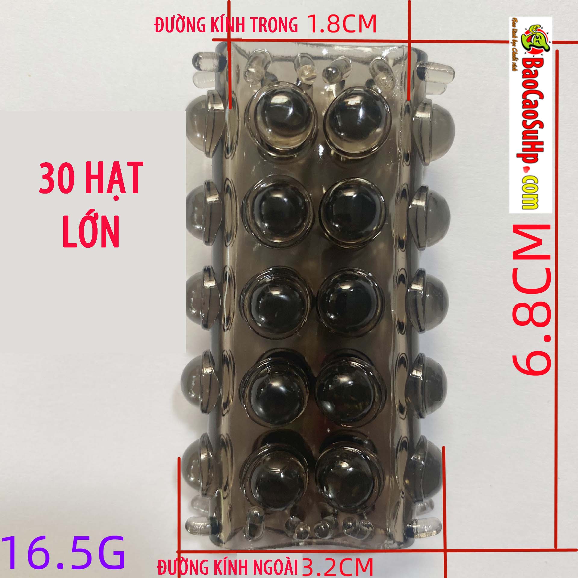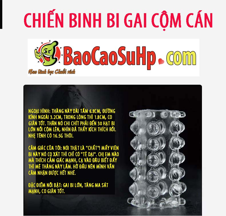 Kích thước dài 6.8cm, đường kính ngoài 3.2cm, trong lòng 1.8cm, trọng lượng nhẹ chỉ 16.5g. Mặt ngoài phủ khoảng 30 hạt bi lớn nổi cộm, tạo cảm giác ma sát mạnh mẽ, kích thích tê dại khi tiếp xúc. Đây là lựa chọn hoàn hảo cho những ai thích cảm giác mạnh và chân thực nhờ thiết kế hở đầu.