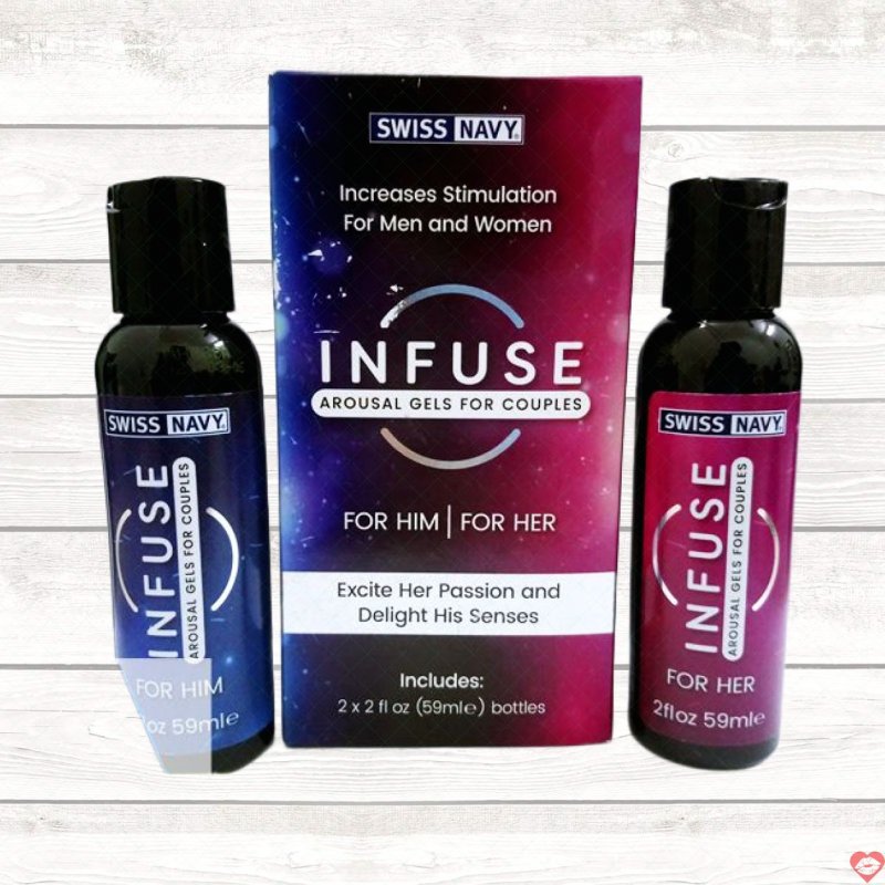 Gel được chia thành hai lọ riêng biệt: For Him dành cho quý ông và For Her dành riêng cho phái đẹp. Swiss Navy Infuse For Him tạo cảm giác hưng phấn cực độ, kích thích ham muốn “lên đỉnh” nhanh chóng. Trong khi đó, Swiss Navy Infuse For Her giúp vùng kín nhạy cảm hơn, tăng khoái cảm mạnh mẽ, dễ dàng đạt cực khoái khi quan hệ.